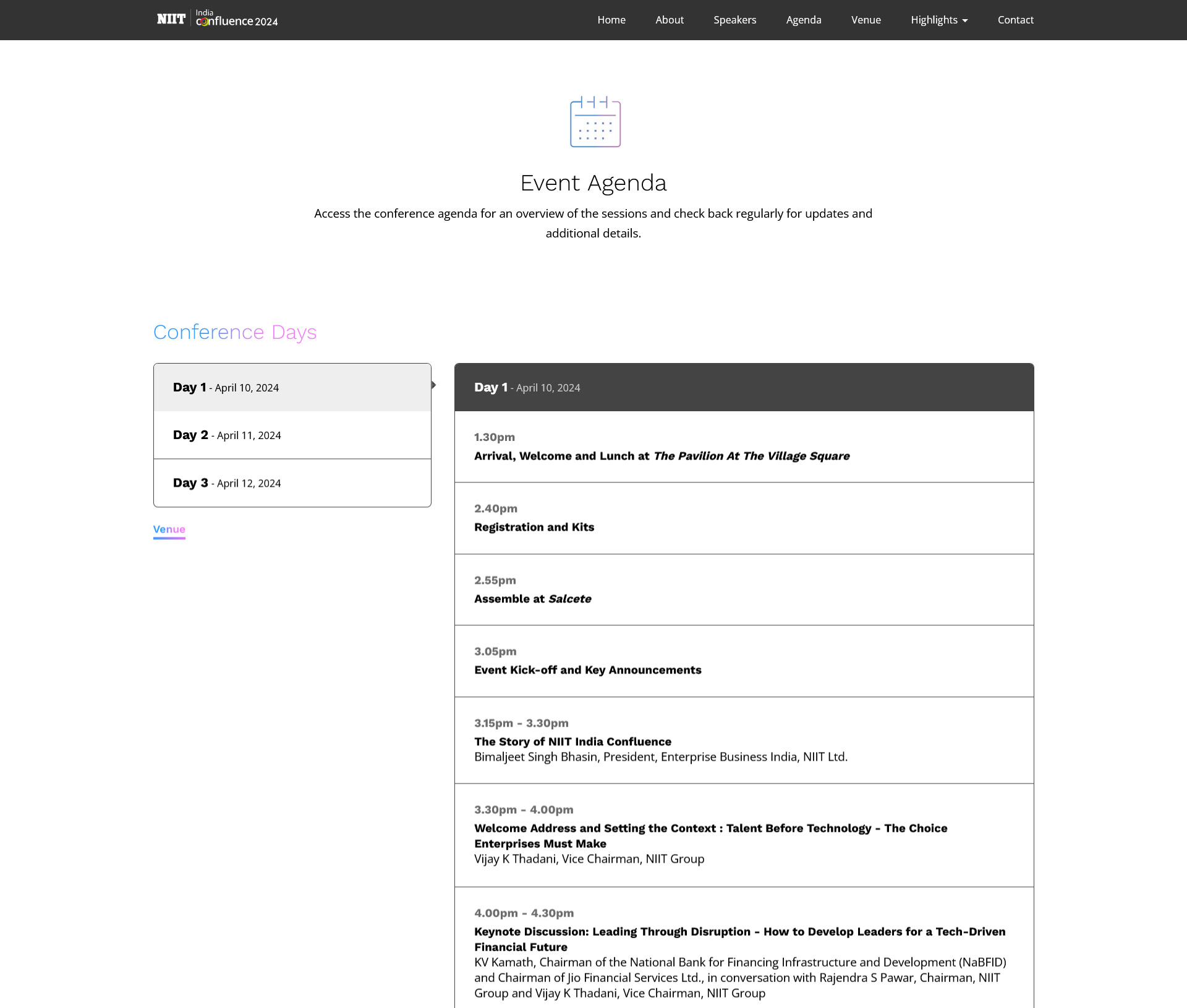 The NIIT Confluence 2024 event website was crafted to mirror the event's theme: Talent Before Technology: The Choice Enterprises Must Make. The design emphasizes clarity and engagement, featuring a streamlined layout that guides users through event details, speaker profiles, and agendas. A harmonious blend of modern typography and a subdued colour palette ensures readability and aesthetic appeal. Interactive elements, such as dynamic schedules and multimedia integrations, enhance user interaction, while responsive design guarantees accessibility across devices. This cohesive digital platform effectively encapsulates the conference's focus on transformative learning and strategic decision-making in the digital age.
